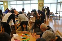 当日は、学生と高齢者の方々が小グループに分かれ、クリスマスリース作りをしながら語り合い、一緒に協力して作品を完成させました。折り紙で作ったヒイラギの葉っぱを組み合わせ、一つの作品となった時には歓声が上がりました。